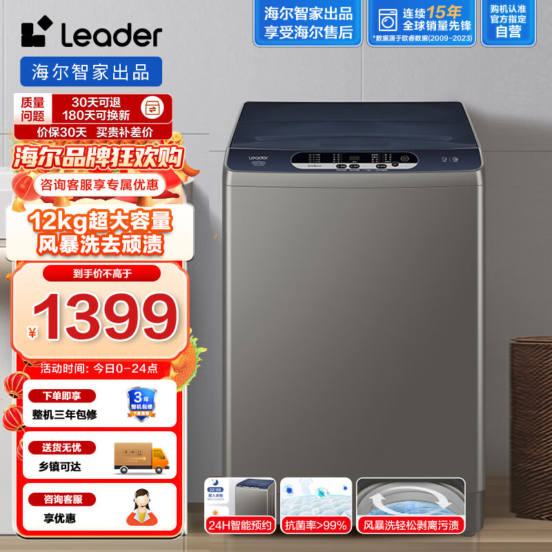 Leader海尔智家出品 波轮洗衣机全自动 12公斤大容量 风暴洗去顽渍 洗衣参数可调 以旧换新 TQB120-Z958价格:1399.00元!