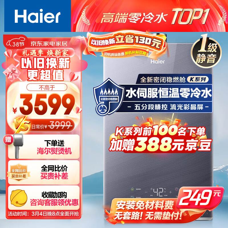 海尔(Haier)16升【大温泉】燃气热水器天然气 TSI增压零冷水 无级变频水伺服 五段微火控温JSQ31-16KN5致远U1价格:3899.00元!