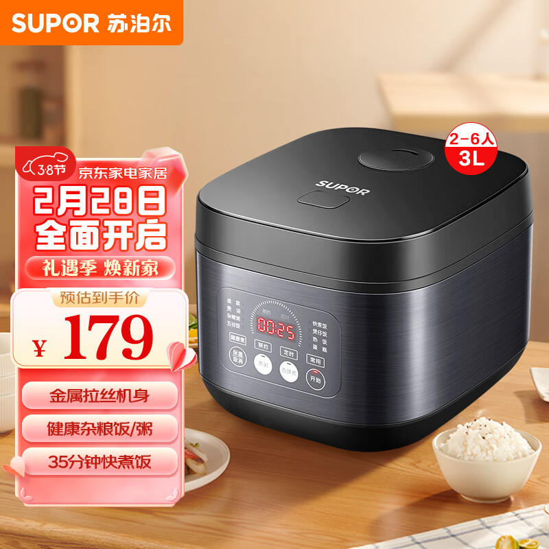 苏泊尔(SUPOR)电饭煲电饭锅3L铜晶不粘内胆2-6人前置大屏面板杂粮养生饭多功能家用智能电饭煲30FC996价格:168.00元!