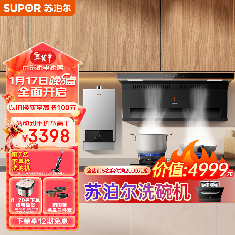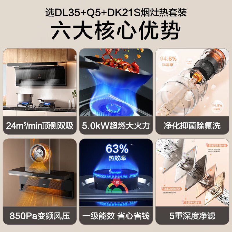 苏泊尔(SUPOR)抽油烟机 双腔拢烟顶侧双吸油烟机套装 24立方吸力变频烟灶热套装 DL35+Q5天然气+DK21S(13R)价格:3398.00元!