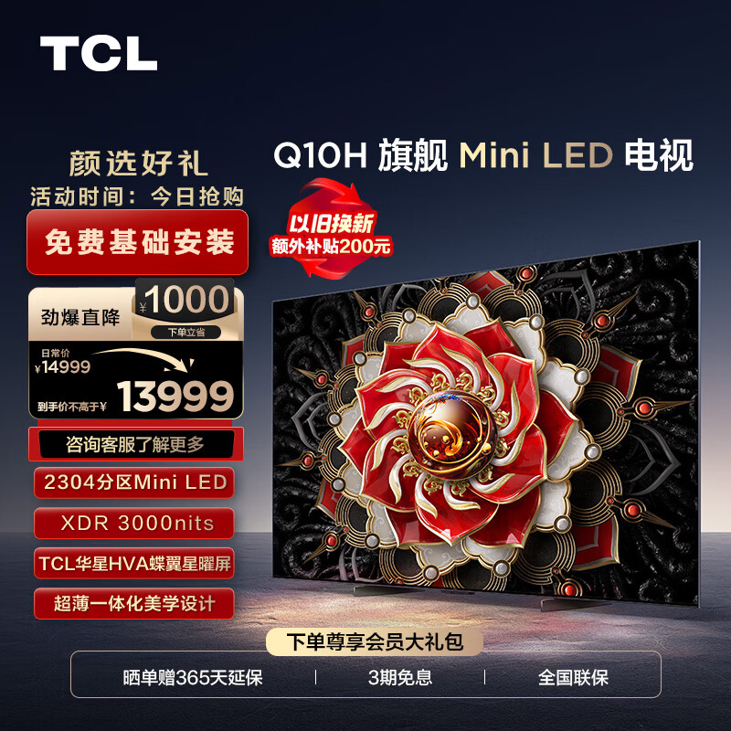 TCL电视 85Q10H 85英寸 Mini LED 2304分区 XDR 3000nits 超薄 4K巨幕 液晶智能平板电视机价格:13999.00元!