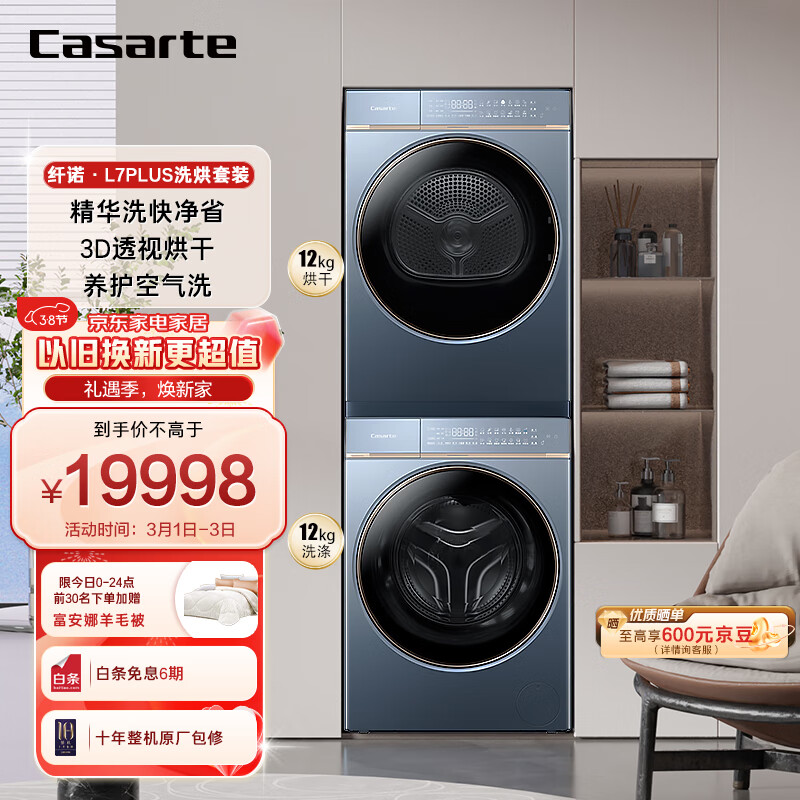 卡萨帝(Casarte)纤诺L7洗烘套装 精华洗滚筒全自动+双擎热泵烘干机 呼吸窗 3D透视烘干CGY 12FL7EU1+C1 DN12L7ELU1价格:19998.00元!