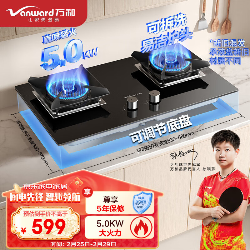 万和(Vanward)燃气灶天然气 双灶具 家用5.0kW猛火灶台嵌两用 钢玻面板 可调节底盘 65%热效率JZT-C5L90S 天然气价格:599.00元!