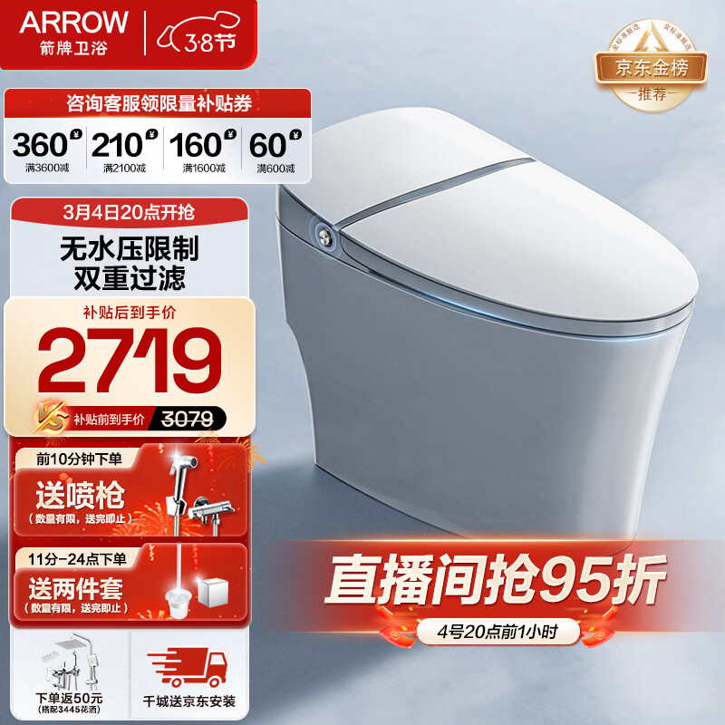箭牌(ARROW)低水压限制智能马桶虹吸式电动一体机坐便器家用双水路AKE1138M价格:3619.00元!