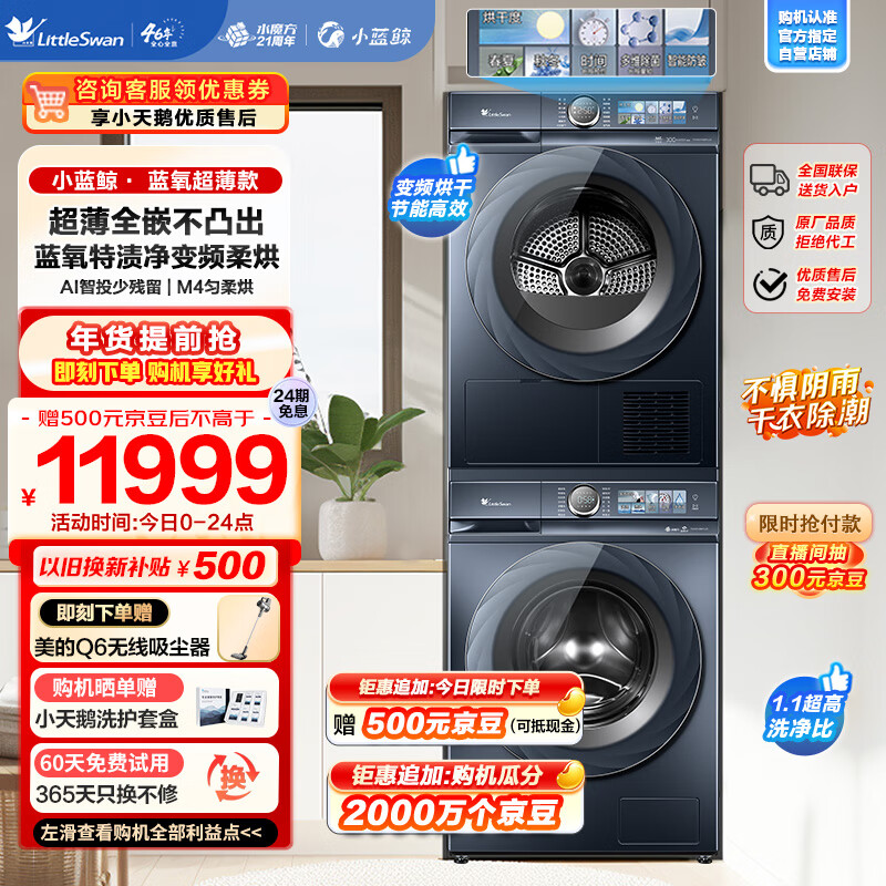 小天鹅(LittleSwan)洗烘套装 10KG滚筒洗衣机全自动+变频热泵烘干机 本色蓝氧 超薄全嵌【小蓝鲸】TG100V88PLUS+VH88价格:12499.00元!