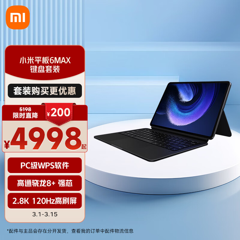 小米平板6 MAX14英寸 高通骁龙8+ PC级WPS 2.8K 120Hz 12+512GB大屏办公平板电脑 黑色【键盘套装】价格:4998.00元!