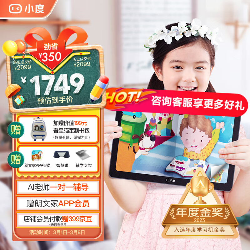小度学习机G16Pro(6+256GB)小学到高中学生平板电脑 AI家教机 百度文心大模型 护眼 郎文家 家长管控价格:1799.00元!