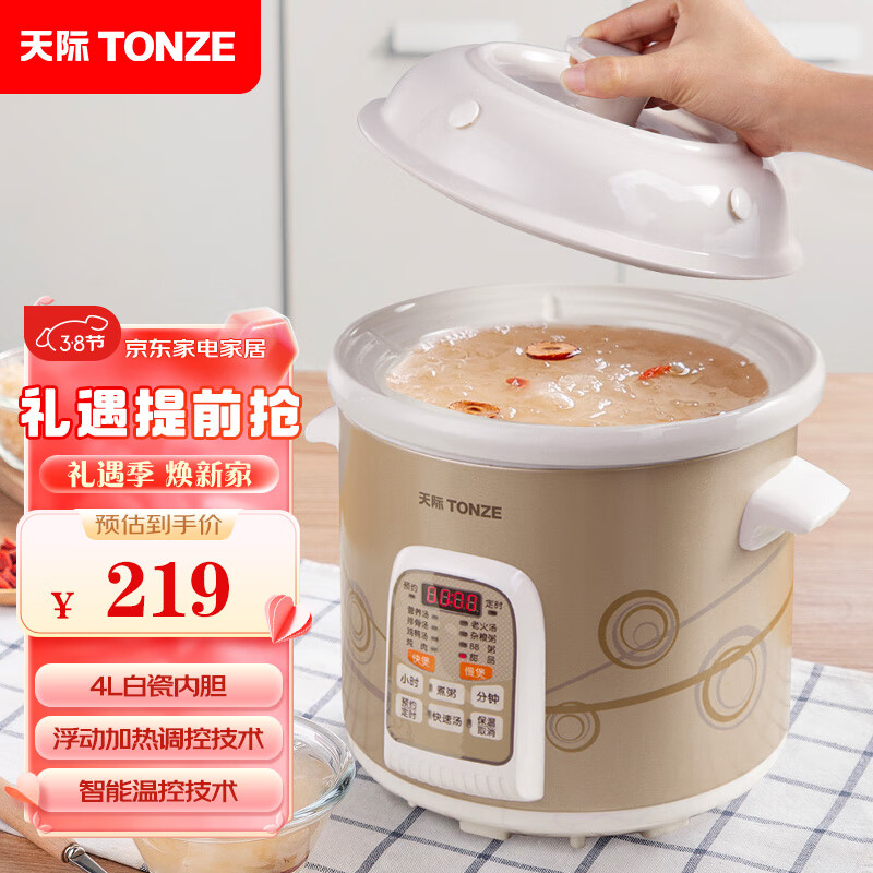 天际(TONZE)电炖锅 4L大容量电炖盅 煲汤锅炖汤锅 婴儿煮粥锅 熬粥养生锅 快速焖炖 直炖白瓷胆 DGD40-40CWD价格:219.00元!