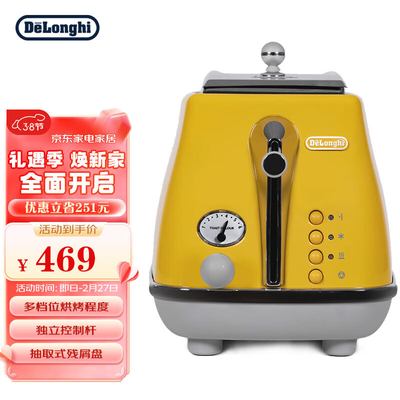 德龙(Delonghi)面包机 复古系列多士炉 不锈钢内胆烤吐司机 家用烤面包机 CTOC2003.Y 波西塔诺黄价格:469.00元!