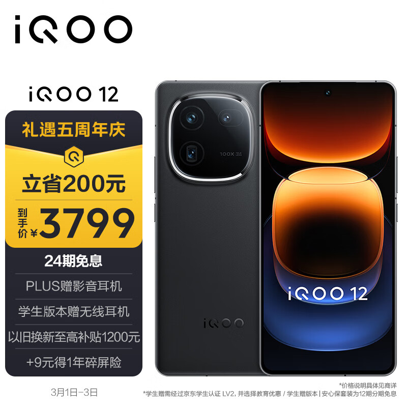 vivo iQOO 12 12GB+256GB赛道版 第三代骁龙 8 自研电竞芯片Q1 大底主摄潜望式长焦 5G手机价格:3999.00元!
