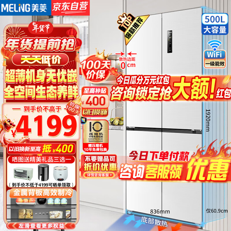 美菱(MeiLing)500升十字对开门冰箱四开门嵌入式一级能效底部散热超薄60.9cm白色双变频净味电冰箱BCD-500WPU9CF价格:4399.00元!