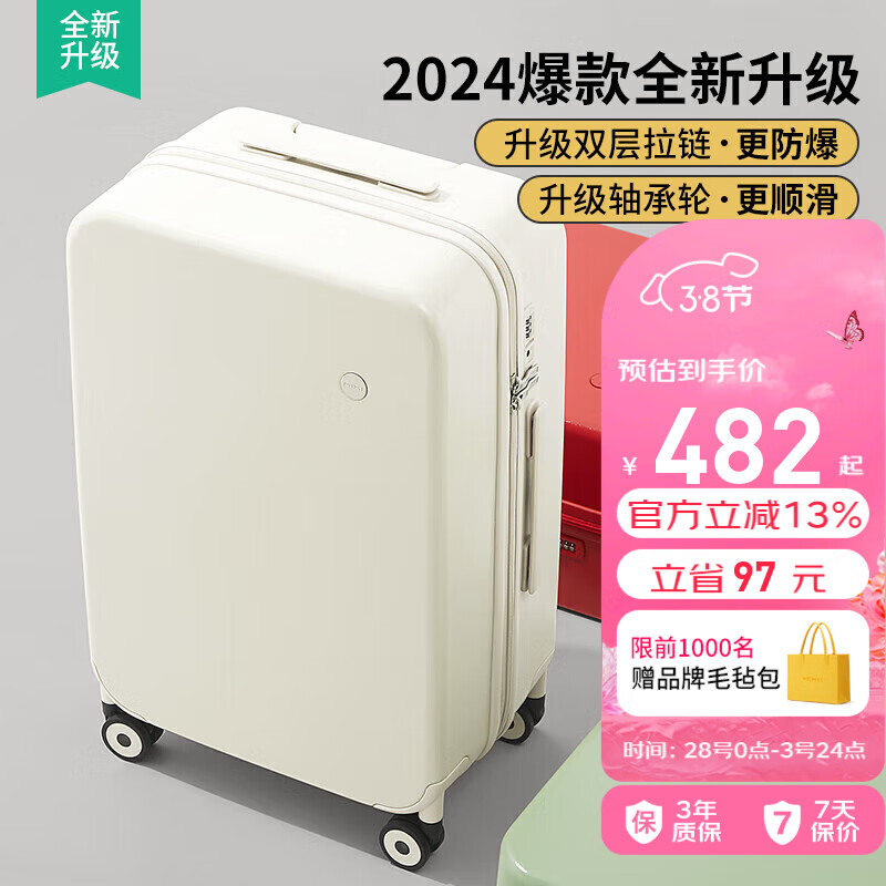 米熙高颜值拉杆箱子行李箱大容量旅行箱男密码箱女大托运箱28英寸烟白价格:579.00元!