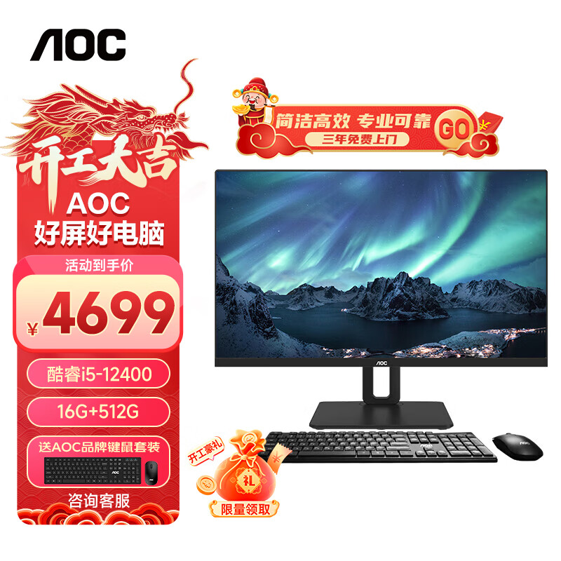 AOC大师926Plus 27英寸 2K 高清办公一体机台式电脑(12代i5-12400 16G 1T 无线WiFi6 旋转升降 )深灰价格:4499.00元!