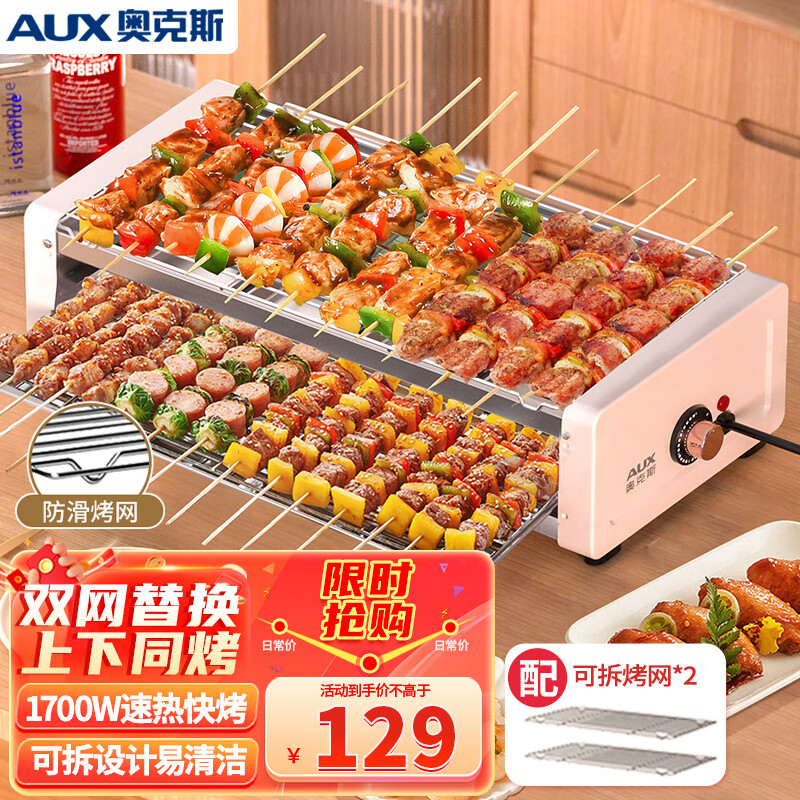 奥克斯(AUX)电烧烤炉 电烤盘家用少烟电烤架烧烤架烤肉机电烤炉烤肉锅烤串机 双烤网价格:129.00元!