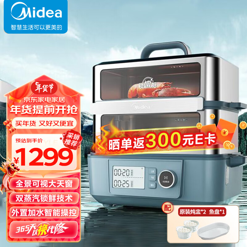 美的(Midea)锁嫩舱3.0家用电蒸锅智能烹饪多功能锅可视分区一锅多用不锈钢蒸炖锅锁嫩舱多用途锅MZ-ZGS352202价格:1299.00元!