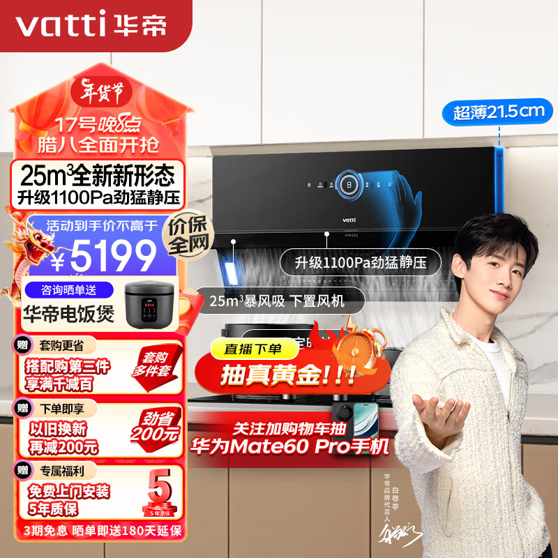 华帝(VATTI)抽油烟机超薄近吸家用侧吸变频大吸力燃气灶具烟灶套装25风量自动清洗华帝超薄小魔盒i11C16天然气价格:5198.00元!