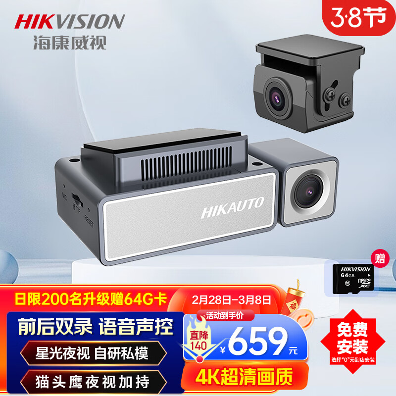HIKVISION海康威视行车记录仪2022款C8 4K高清夜视前后双录双镜头 语音声控价格:689.00元!