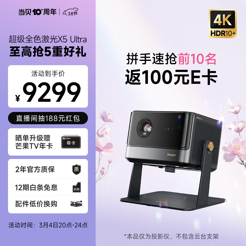 当贝 X5Ultra 超级全色激光 4K 投影仪家用 X5U游戏投影机 (2500 CVIA流明 MT9679大师芯片 6+128G)价格:9299.00元!