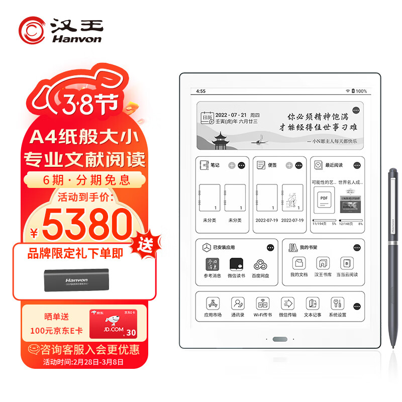 汉王N10Max2024款 电纸书13.3英寸微信读书阅读器专业文献PDF护眼阅览器水墨墨水屏平板办公手写记事本价格:5380.00元!