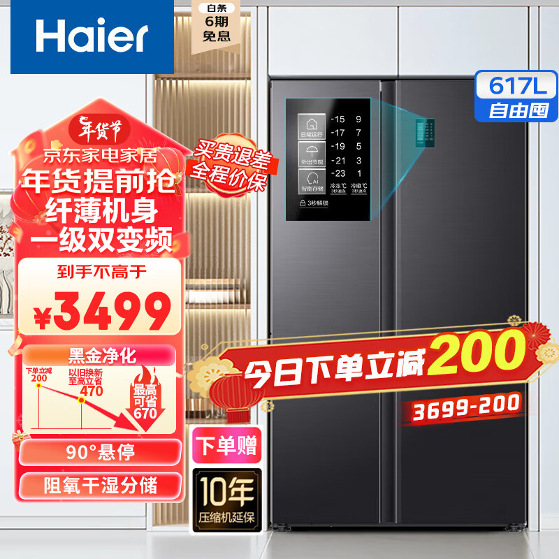 海尔(Haier)617升冰箱双开门对开门纤薄一级能效双变频风冷无霜阻氧干湿分储大容量家用 黑金净化+90°开门悬停价格:3486.00元!
