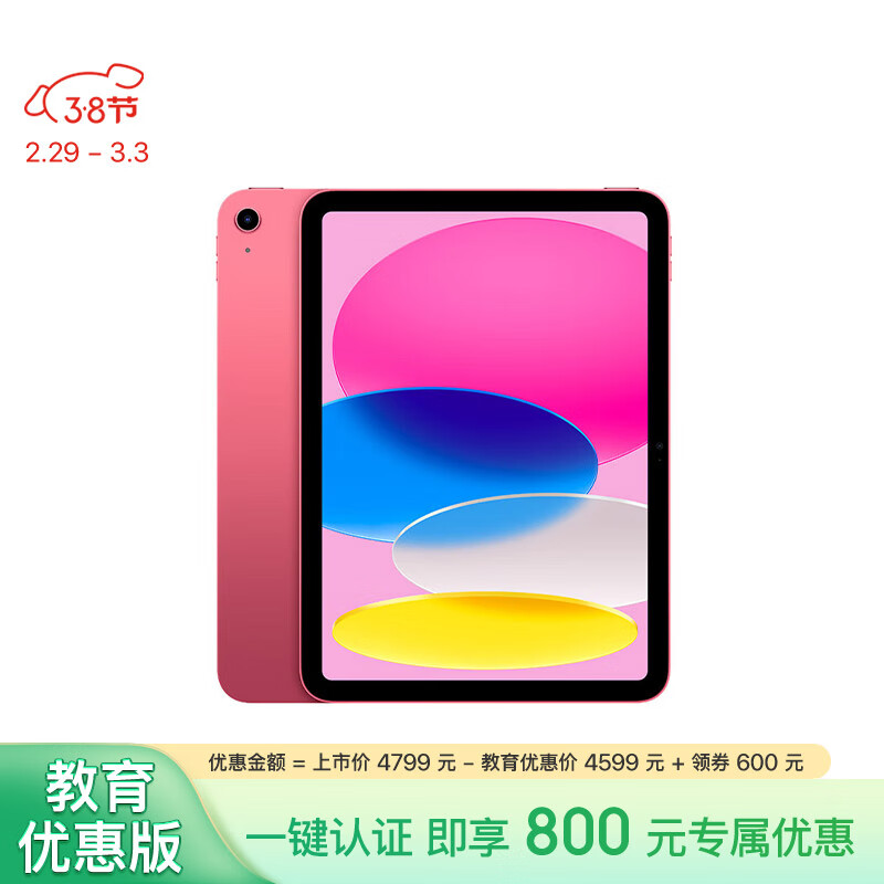 Apple/苹果【教育优惠】iPad 10.9英寸 2022款(256GB WLAN版/A14芯片/学习办公娱乐/MPQC3CH/A)粉色价格:4599.00元!