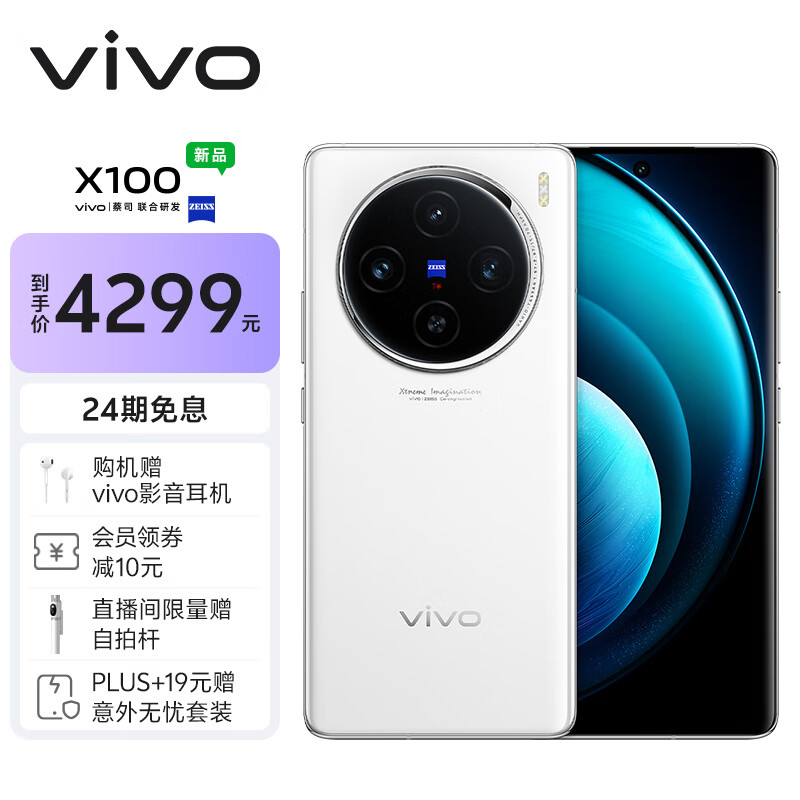 vivo X100 16GB+256GB 白月光 蓝晶×天玑9300 5000mAh蓝海电池 蔡司超级长焦 120W双芯闪充 拍照 手机价格:4299.00元!