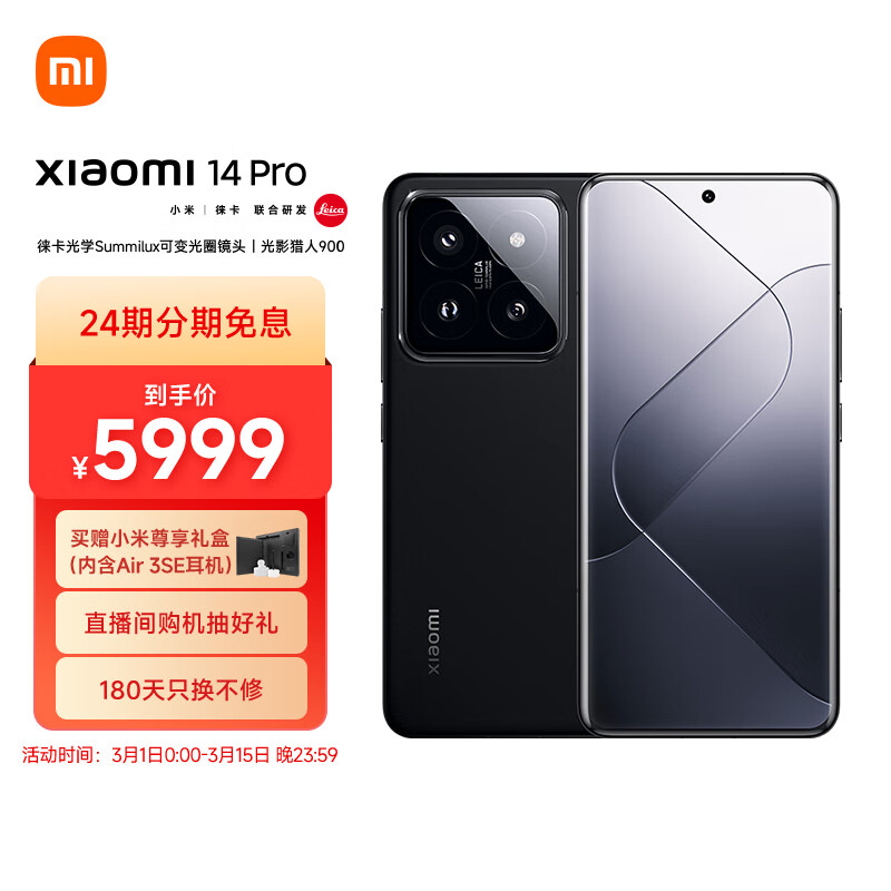 小米14Pro 徕卡可变光圈镜头 光影猎人900 小米澎湃OS 骁龙8Gen3 16+1T 黑色 小米手机 红米手机 5G价格:5999.00元!