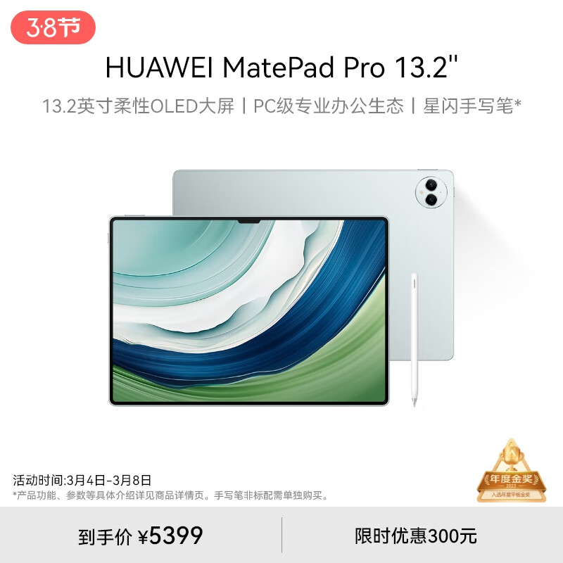 HUAWEI MatePad Pro 13.2英寸 华为平板电脑144Hz OLED柔性护眼屏星闪连接办公创作12+256GB WiFi 雅川青价格:5699.00元!
