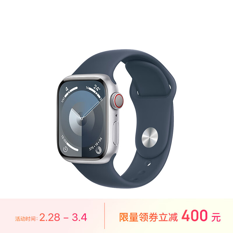 Apple/苹果 Watch Series 9 智能手表GPS+蜂窝款41毫米银色铝金属表壳风暴蓝色运动型表带M/L MRJM3CH/A价格:3799.00元!