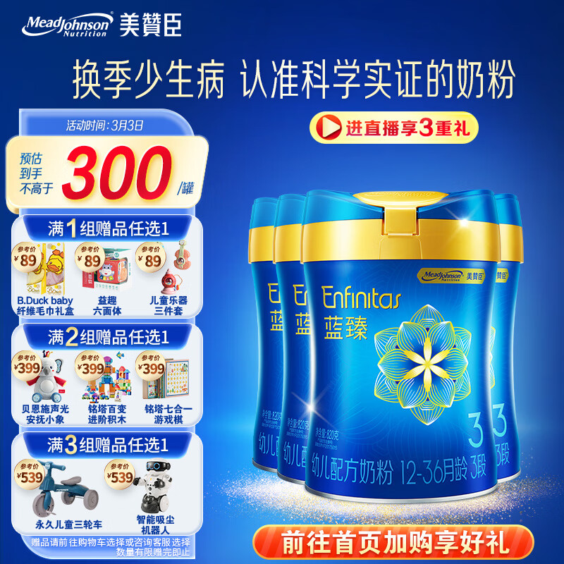 美赞臣蓝臻 幼儿配方奶粉 3段(12-36月)820g*4箱装【24年12月过期】价格:1363.64元!
