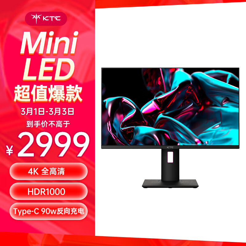 KTC 27英寸 4K144Hz MiniLED量子点广色域 1msIPS低蓝光Type-C90W 旋转升降HDR1000电脑显示器M27P20价格:3199.00元!