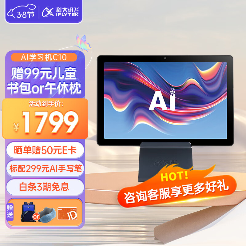 科大讯飞AI学习机C10 10.1英寸 护眼平板电脑 学生平板 英语学习机平板 家教机 小学到高中 4+128GB价格:1798.00元!