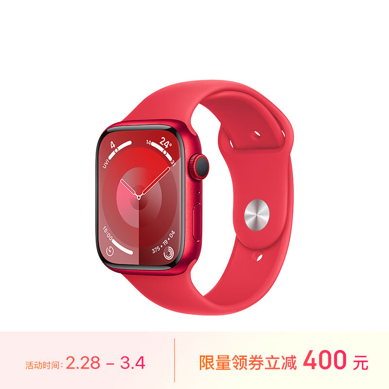 Apple/苹果 Watch Series 9 智能手表GPS+蜂窝款45毫米红色铝金属表壳红色运动型表带M/L MRYH3CH/A价格:3999.00元!
