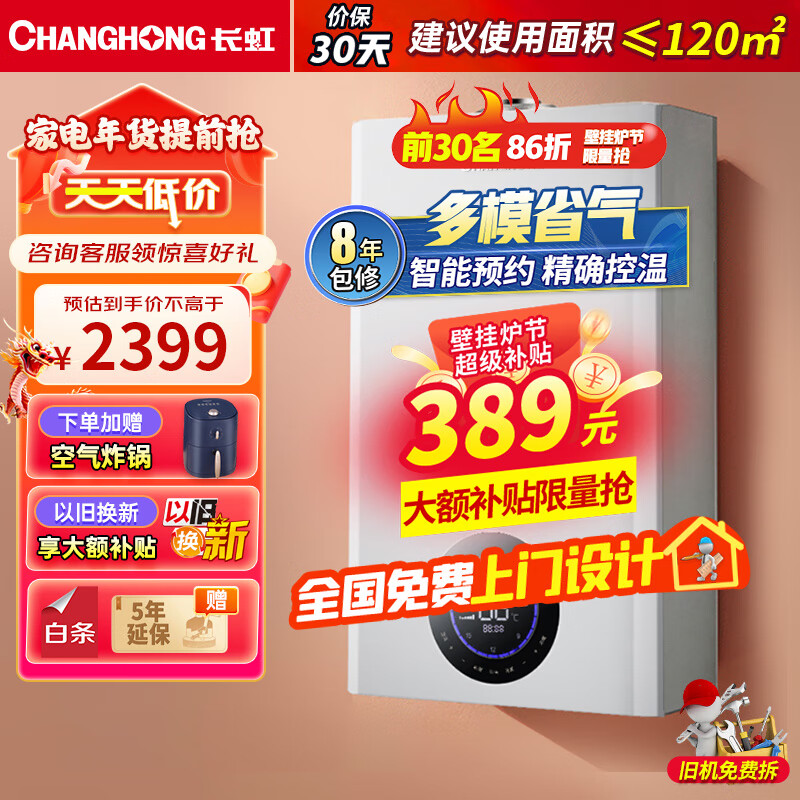 长虹(CHANGHONG)家用燃气壁挂炉天然气采暖炉锅炉多分段燃烧供暖暖气地暖热水两用恒温洗浴热水器 智能家电 20U1价格:2399.00元!