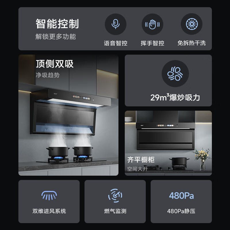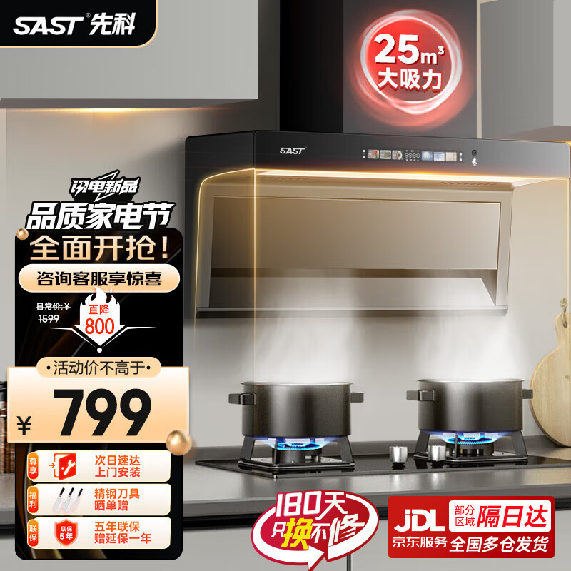 先科(SAST)顶侧双吸抽油烟机燃气灶烟灶套装家用厨房大吸力脱排式7字吸油烟机灶具套装 【行业销冠】25立方顶侧双吸+体感+LED大灯价格:1599.00元!