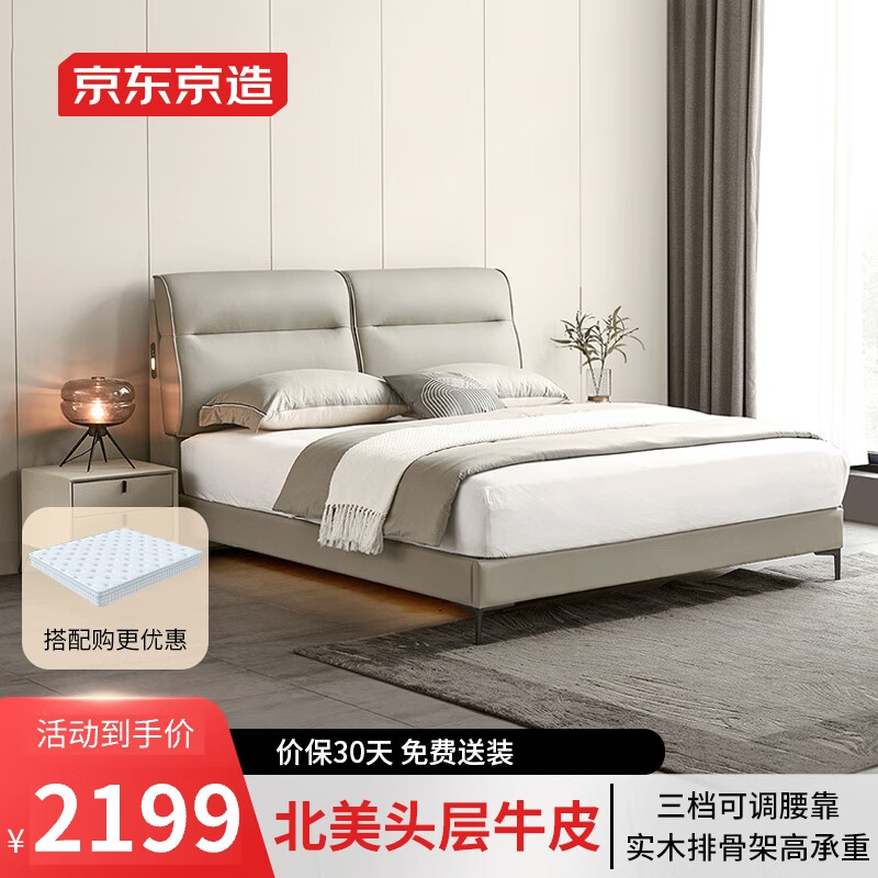 京东京造真皮床 进口牛皮|三档靠背|实木排骨架 主卧双人床1.8米×2米BL01价格:2199.00元!