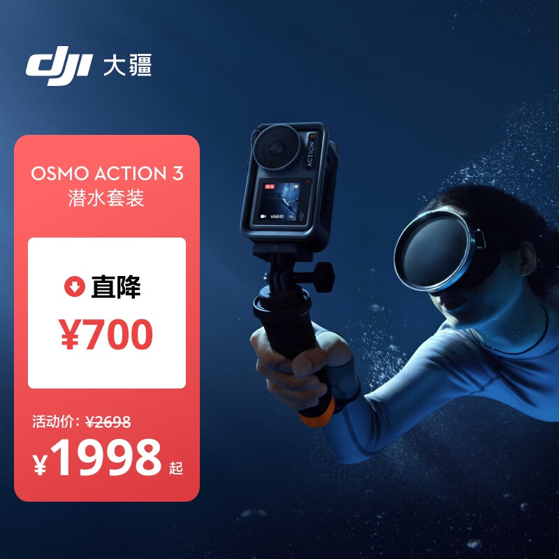 大疆 DJI Osmo Action 3 潜水套装 灵眸运动相机 4K高清增稳小型手持防抖Vlog水下摄像机+随心换2年版价格:2187.00元!