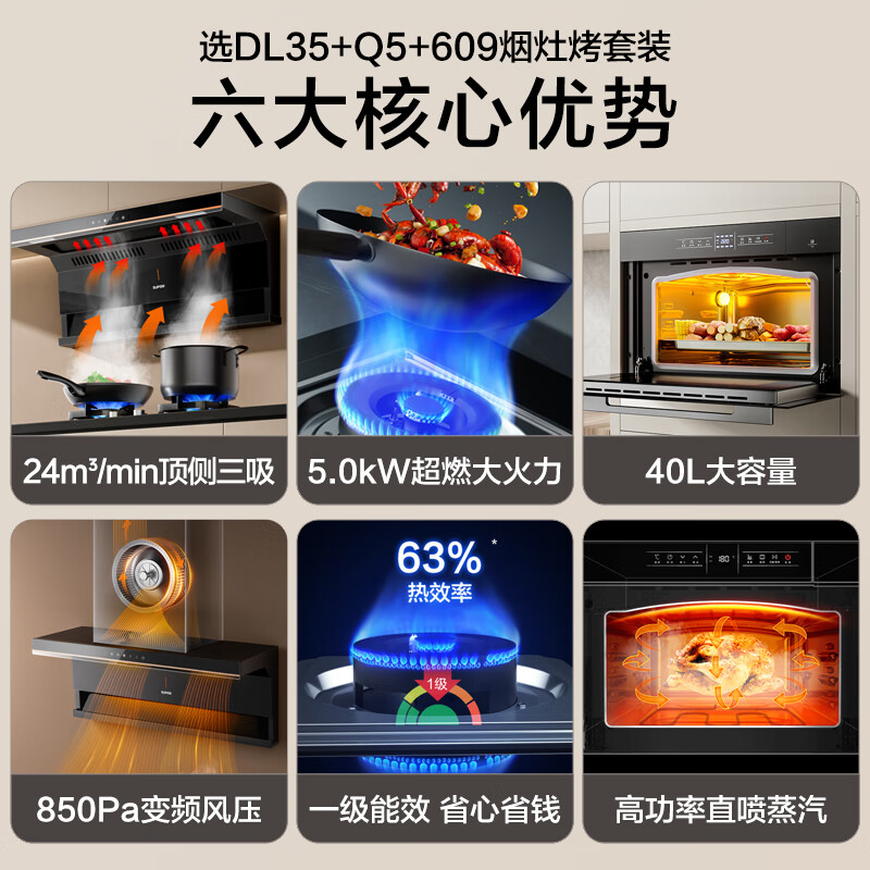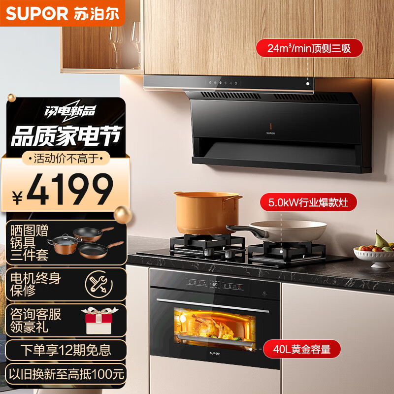 苏泊尔(SUPOR)抽油烟机 双腔拢烟顶侧双吸变频油烟机灶具蒸烤套装 24立方厨房家用烟灶嵌套装 DL35+Q5+609价格:4199.00元!