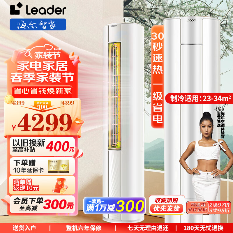 统帅(Leader)空调海尔出品新一级能效2匹全直流变频冷暖空调APP智控立柜式自清洁 智能防直吹以旧换新50WDB81价格:4299.00元!