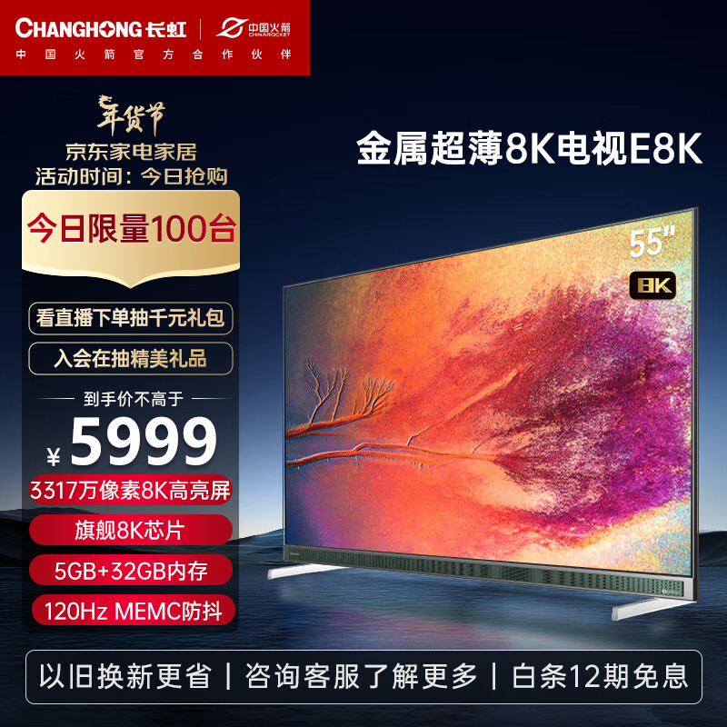 长虹电视55E8K 55英寸超薄真8K WiFi6 HDMI2.1 5+32GB 杜比视听 MEMC LED平板液晶电视机 以旧换新价格:5999.00元!