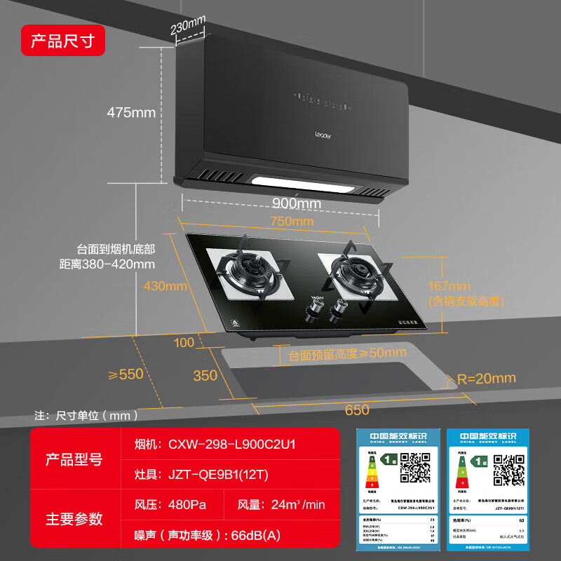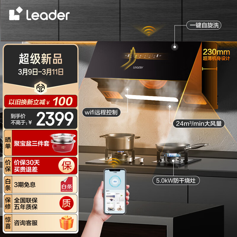 Leader海尔智家出品 抽油烟机 超薄近吸烟灶套装 24m3/min大吸力 家用油烟机燃气灶套装C2U1+QE9B1天价格:2399.00元!