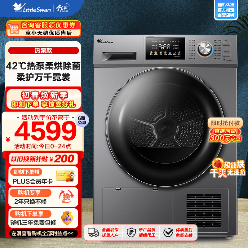 小天鹅(LittleSwan)烘干机 家用干衣机 热泵式紫外线除菌 衣干即停 快烘20分钟 10公斤 晒被子TH100VH87WY价格:4599.00元!