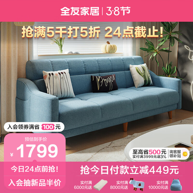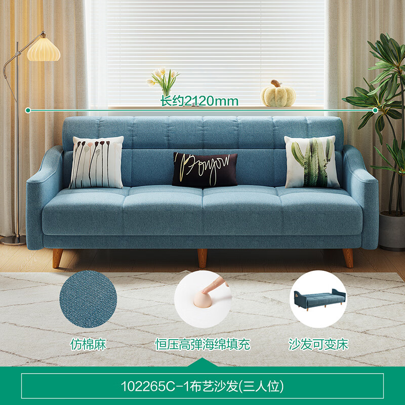全友家居 现代北欧简约布艺沙发客厅三人位小户型可折叠沙发床102265价格:2248.75元!