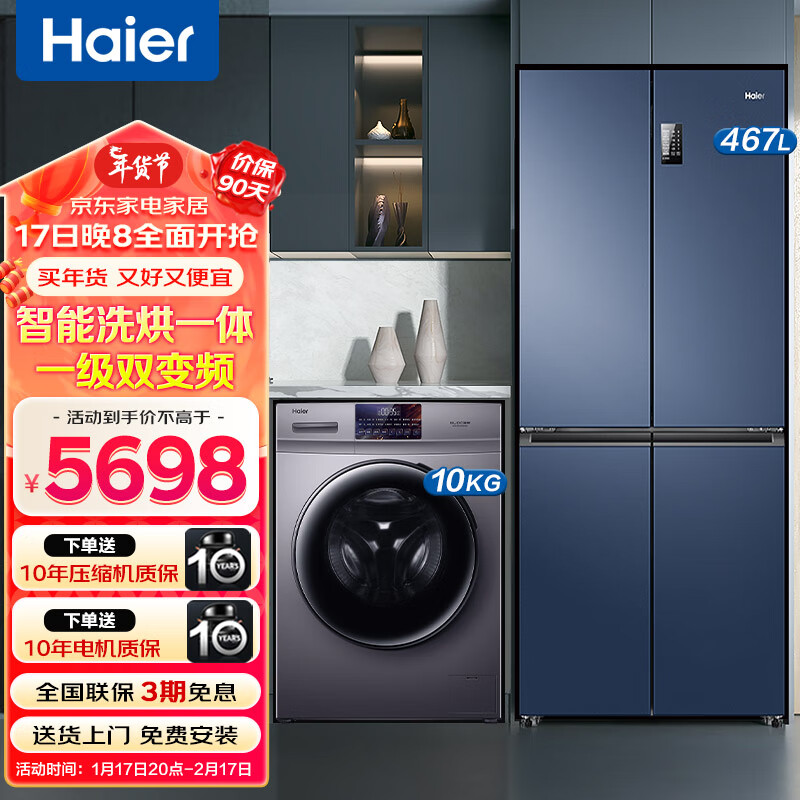 海尔(Haier)冰洗套装 467升一级双变频T形门十字对开门冰箱+10公斤洗烘一体滚筒全自动洗衣机价格:5698.00元!