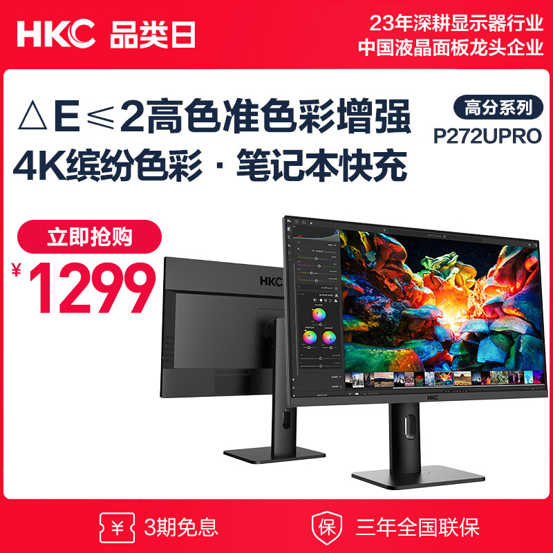 HKC 27英寸 4K高清 IPS Type-C 90W笔记本外接 HDR400电脑屏幕广色域 升降旋转办公显示器 P272U Pro价格:1499.00元!