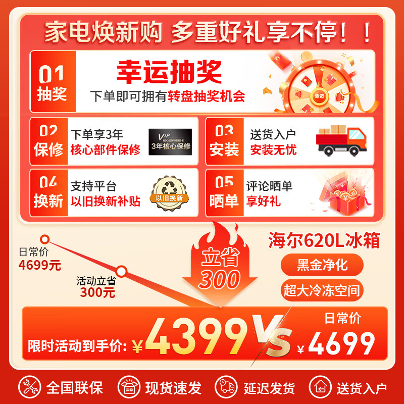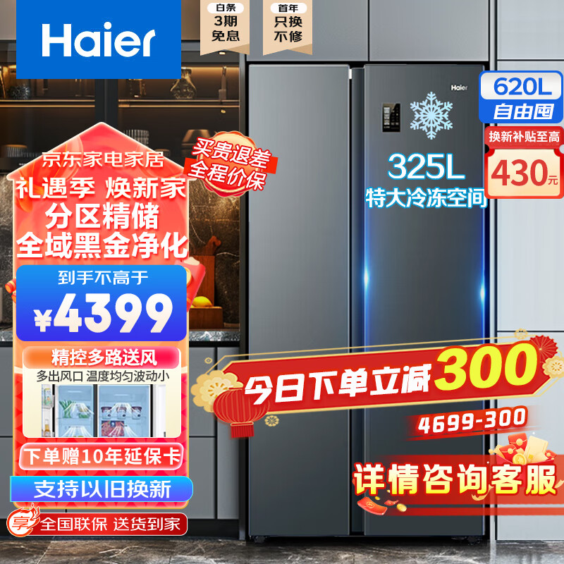 海尔(Haier)620升大容量对开门冰箱 风冷无霜新一级双变频 325L大冷冻空间双开门冰箱 黑金净味保鲜以旧换新价格:4399.00元!