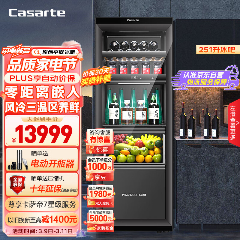 卡萨帝(Casarte)251升三温区原创平嵌零距离嵌入暖藏冰吧 茶叶饮料水果冷藏柜保鲜柜小型冰箱LC-251WLCDFM1U1价格:13999.00元!