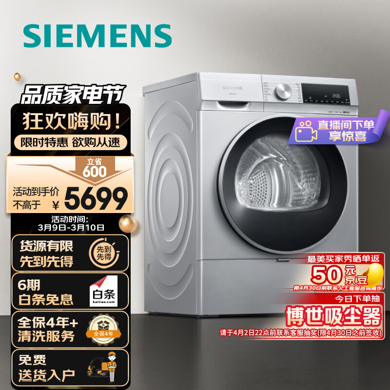 西门子(SIEMENS)iQ300 烘干机家用 10公斤热泵干衣机 除菌除螨 多维立体烘干 蚕丝柔护 羽绒烘 D80W价格:6299.00元!