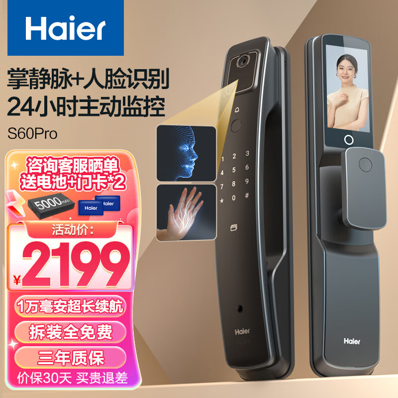 海尔(Haier)掌静脉人脸识别智能门锁防盗门智能锁带可视猫眼密码锁入户门带摄像头指纹锁电子锁门锁S60Pro价格:2199.00元!