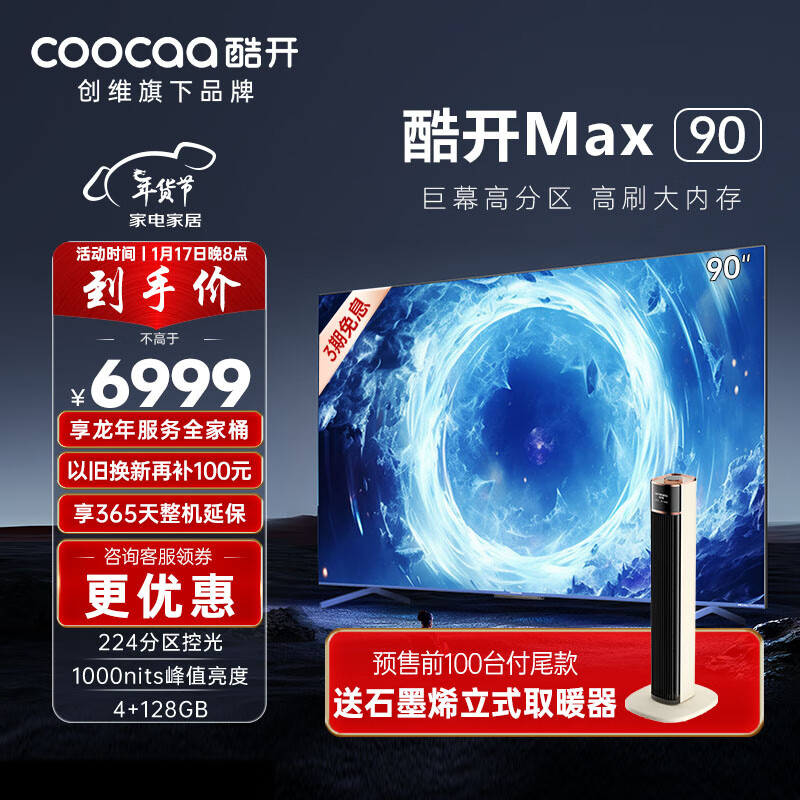 酷开创维Max90 90英寸电视 224分区控光 1000nits峰值亮度4+128G 120Hz高刷护眼声控智能电视机90P60 P价格:6999.00元!
